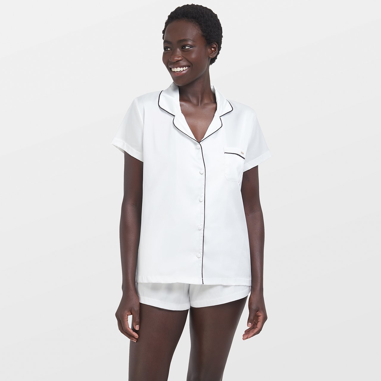 Notre ensemble best-seller chemise et short Abigail est désormais disponible dans un coloris ivoire très frais. Avec son liseré et son nœud contrastés, cest lensemble parfait pour le printemps.